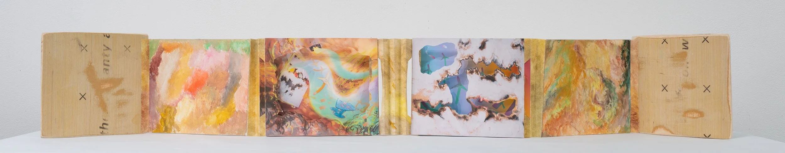 Everyday Utopias - Artist's book. Scrap wood, torched pastel on paper, inkjet print of digital painting, acrylic paste painting, tyvek.