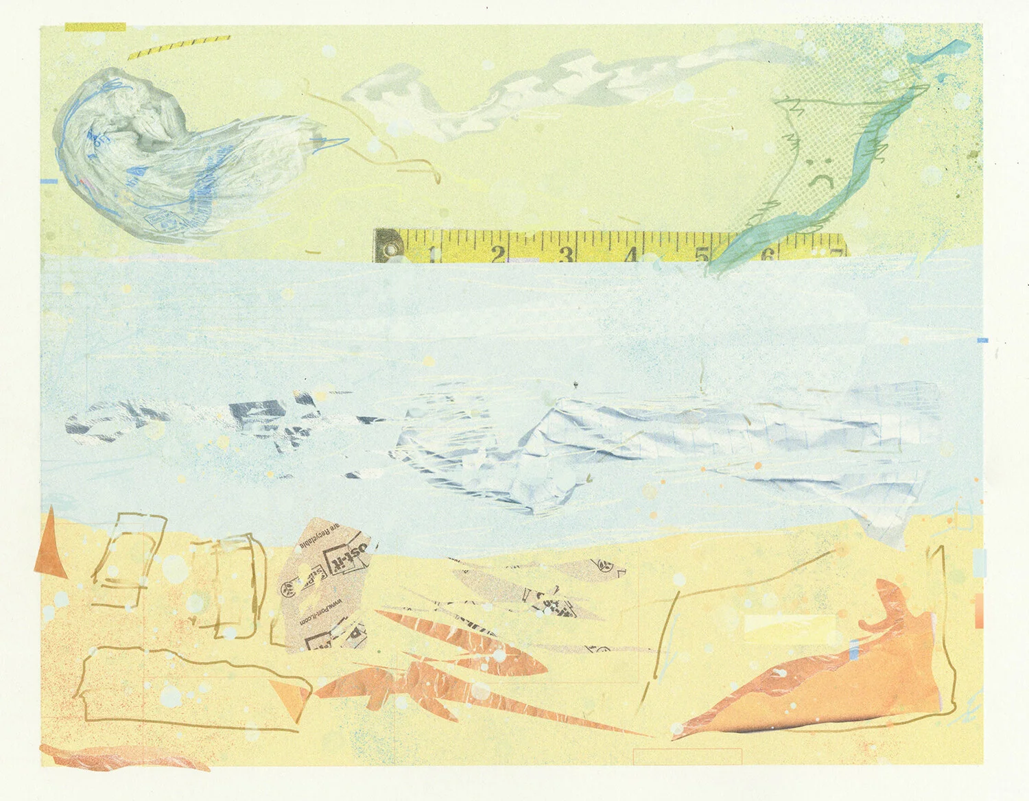 Created in the Spring and Summer of 2021 during a period when the internet, classrooms and remote learning were subjects of national import, the space of a classroom began to emerge as the series developed. This resulted in works that parodied classroom motivational posters with dark humor about children’s futures with climate change, in the context of the United States’s history of slow, reluctant response to the issue’s urgencies. This was balanced with pieces that offered a more optimistic view of a sustainable future being possible. The motif of children creating art projects about building a sustainable future, all the while existing amidst an environment of virtual information overload, become a focus which would inform the following series, Possible Landscapes. Spinning off from the art movements of Casualism (coined by Sharon Butler), Post-internet and Pop art, this series of paintings, prints, photos, assemblages and installation was developed to be ‘fast and loose’, in tandem with the speed of gigabytes and gigafires.